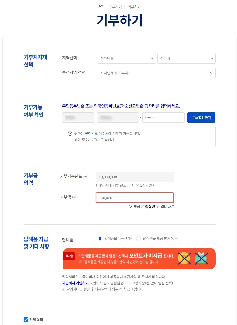 [신청시 답례품을 제공받음에 꼭 체크하세요.]